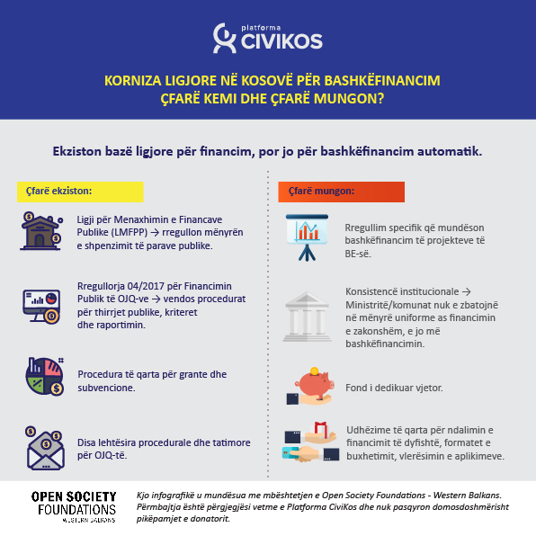 Në Kosovë ekziston bazë ligjore për financim publik të OJQ-ve (p.sh. Ligji për Menaxhimin e Financave Publike dhe Rregullorja 04/2017), si dhe procedura për grante/subvencione dhe disa lehtësira procedurale e tatimore.