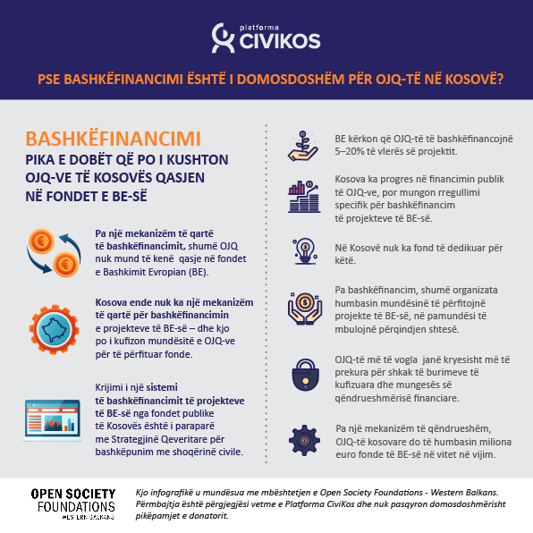 BE kërkon që OJQ-të të bashkëfinancojnë 5–20% të vlerës së projektit, por Kosova ende nuk ka një mekanizëm të qartë (as fond të dedikuar) për bashkëfinancimin e projekteve të BE-së.